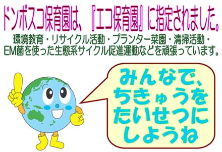 エコ保育園とは、宮崎県が勧める地球温暖化防止対策協議会の事業の一つです。更に今年からは「ドンボスコ エコクラブ」に進級??全国エコクラブの一員になりました。どんなことをしているかは、昨年度の報告書・写真をご覧ください。