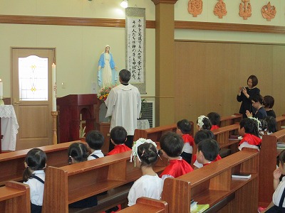 園長先生のお話を聞いて教会でのお祈りを終え