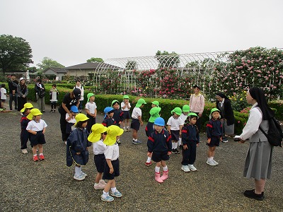 初めに園庭の聖母マリア様のところで朝のお祈りをして