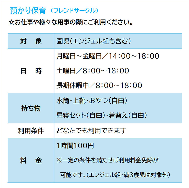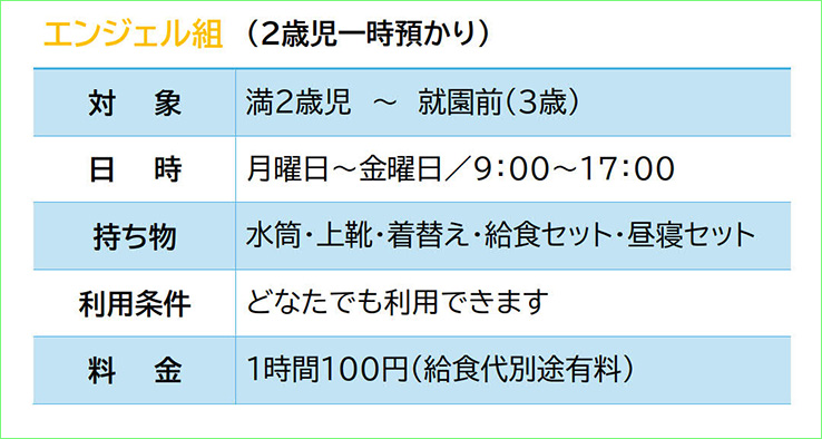 ![]() ☆エンジェル組(一時預かり)潜竜聖母幼稚園では子育て支援の一環として、幼児(2歳~)の一時預かり保育を行っています。9時~14時までの間で潜竜聖母幼稚園の教育に準ずる教育・保育を提供しており、どなたでも利用できます。子ども達同士の関わりの体験を通して、集団生活を体験し、社会性を身につけていけるよう援助しています。料金は1時間100円で、給食利用可(有料)です。 ☆預かり保育
