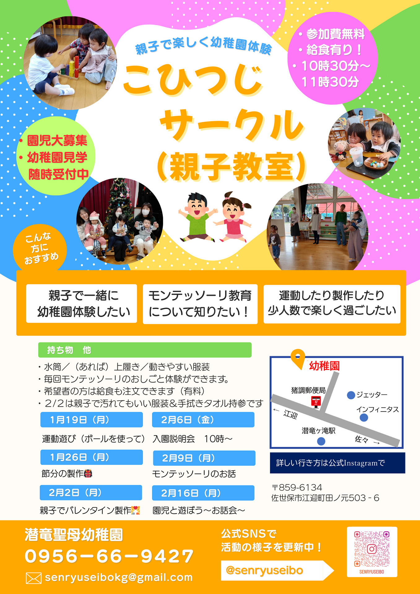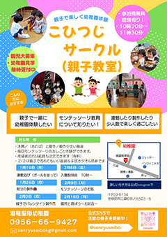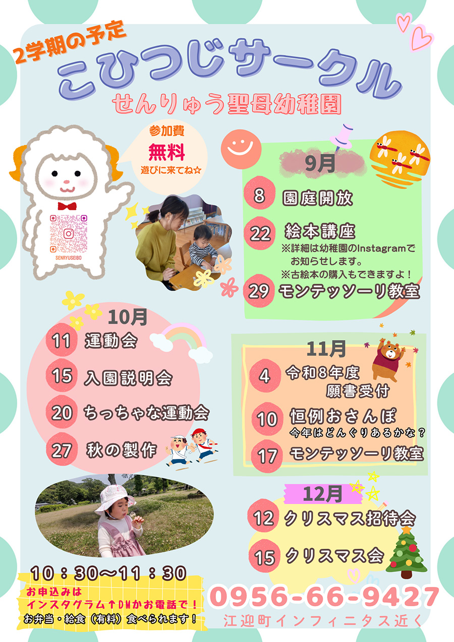 子育て支援潜竜聖母の子育て支援には「こひつじサークル」と「2歳児保育」と「一時預かり保育」があります。保護者同士の情報交換、体験、外で働く方々のお役にたてるサービスがあります。![]() 入園までの早わかりチャート表 ☆こひつじサークルお子さまの心身の成長と、それを支える保護者の子育てを応援する、親子参加型の教室です。園庭・室内を開放し小さいお子様も安心して遊べる場となります。またお母様方同士の情報交換ができる場ともなります。専任の幼稚園担当者から情報を聞くこともできます。モンテッソーリお仕事体験もあります!