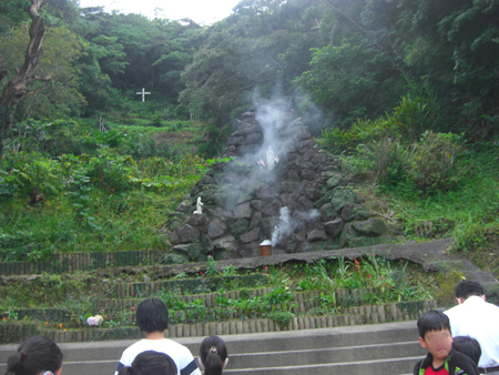 ルルドの前でお祈りカードと塗り絵をおささげしました。