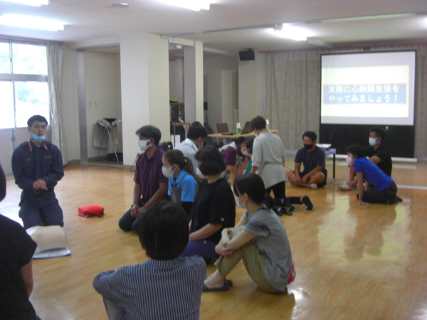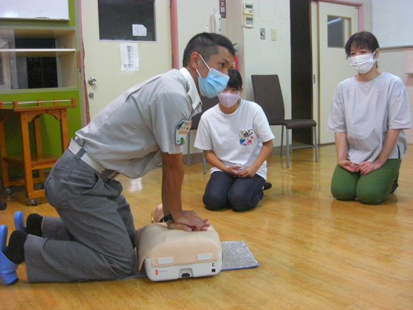 今日は、園内研修として、大島地区消防組合の方に心肺蘇生法の研修をお願いしました。