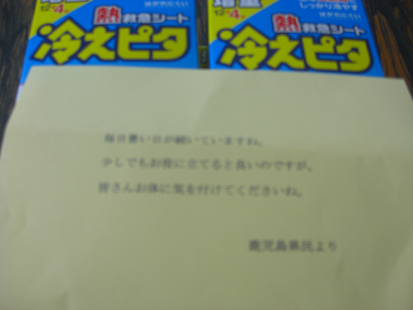 鹿児島県民様(匿名)から お手紙付きの 冷えピタ