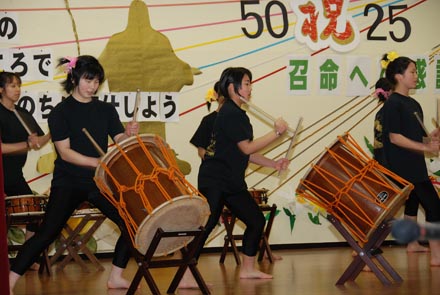 食事の後はお祝いのアカデミア。まずは学生志願者による元気いっぱいの日本太鼓とチアリーダーの演技。たった9名とは思えないほどのパワーあふれる演技に大拍手。続いてスモールクワイアは「WINDING