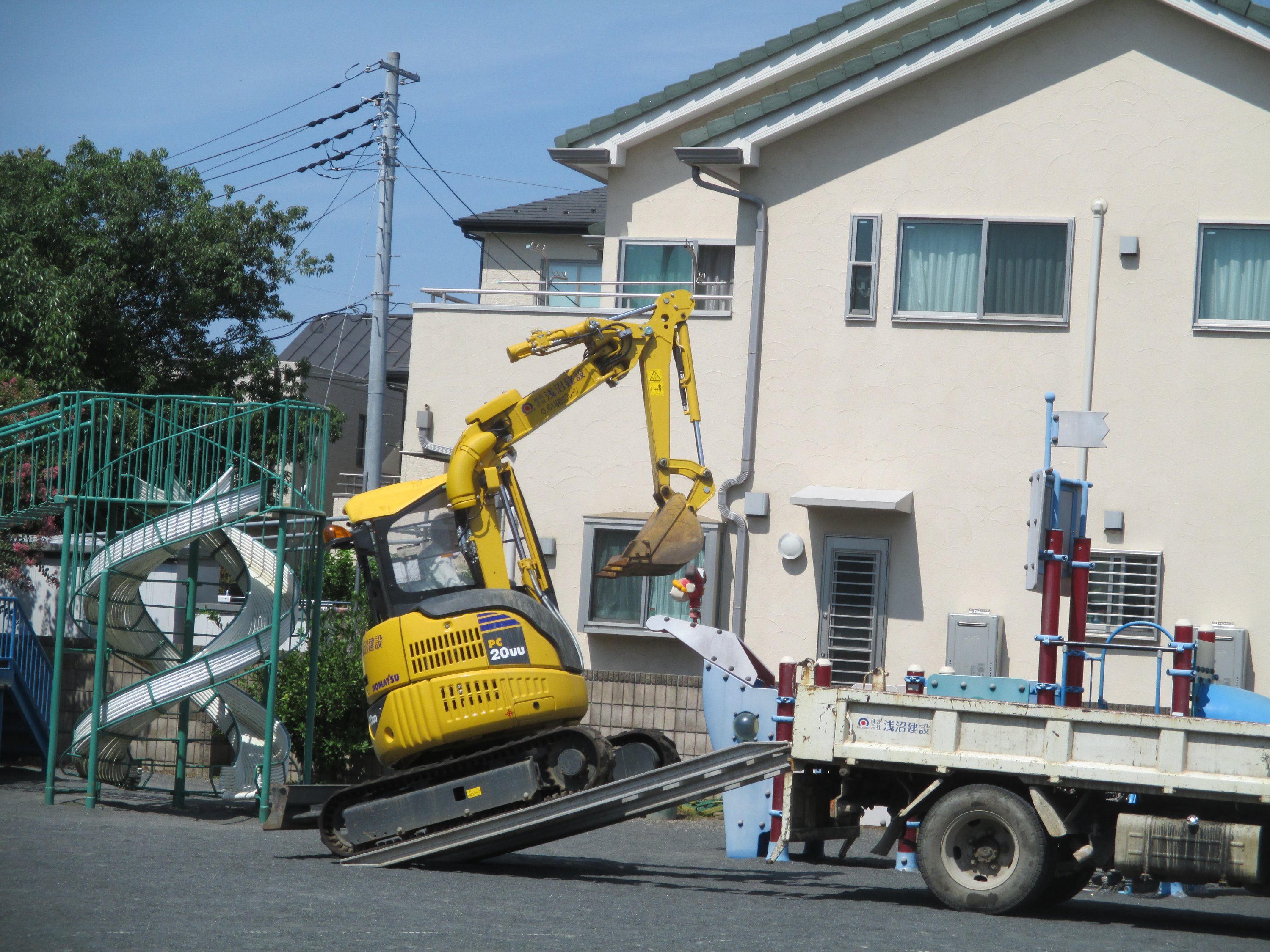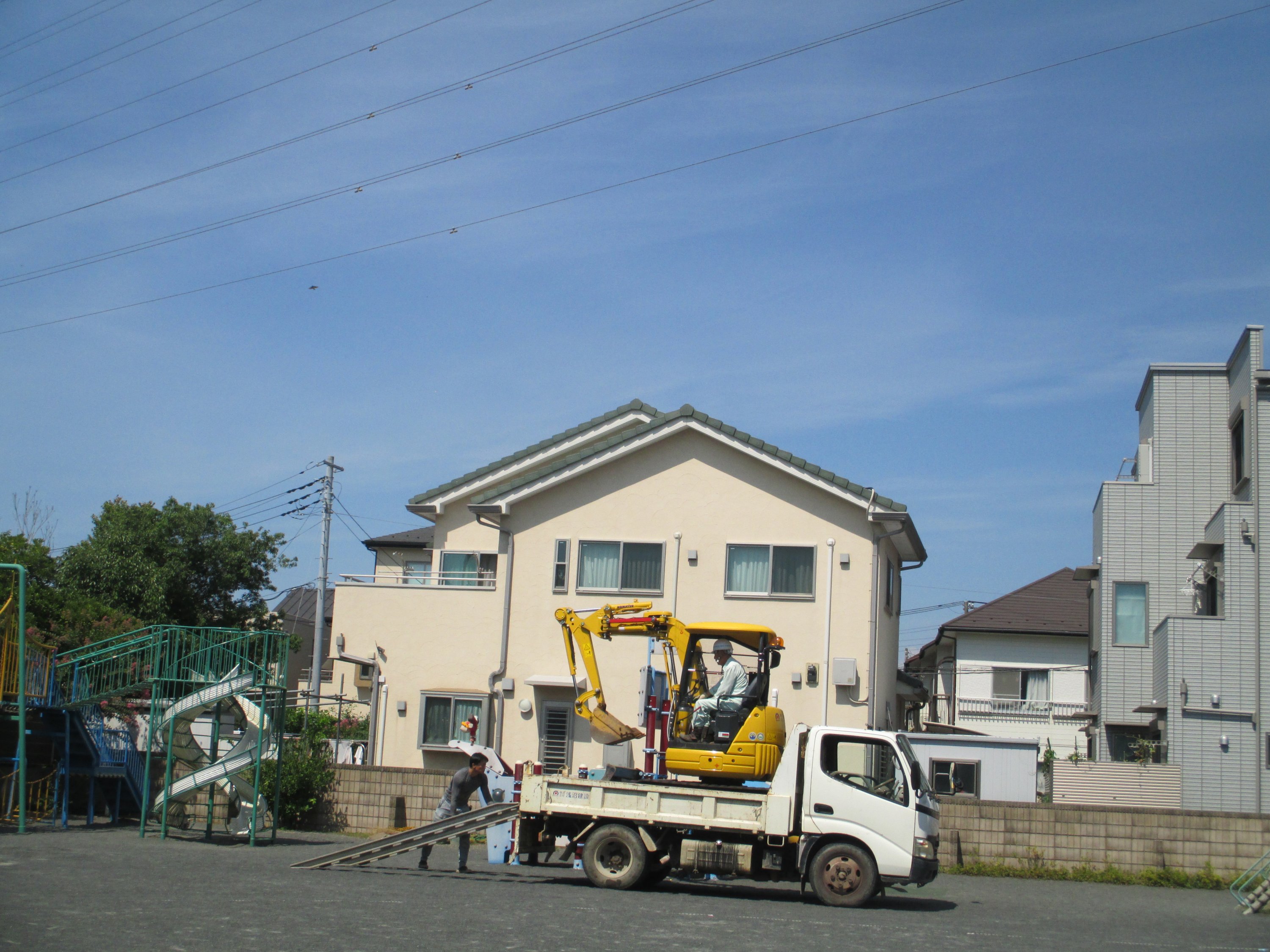 *ショベルカーがバックで園庭に下りていますが