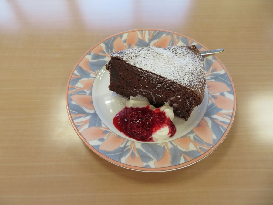 栄養士特製の「ガトーショコラ」に、ラズベリーソースもお手製です。