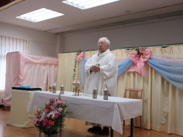 今日の聖堂はいつもと違い馬小屋が祭壇に飾られています。