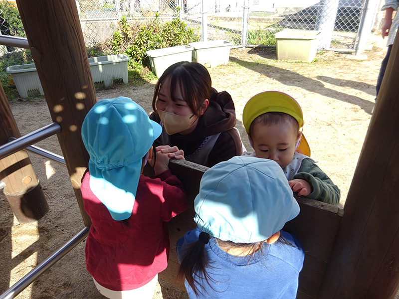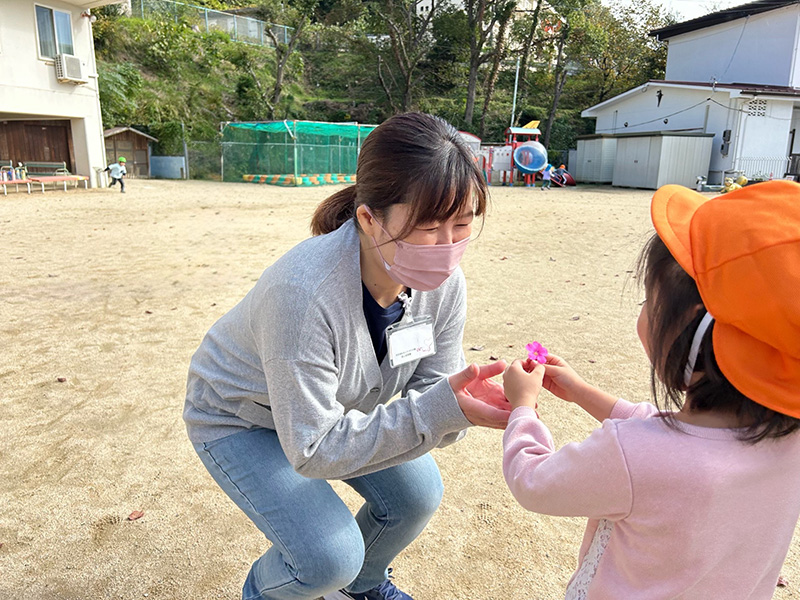 私はこの園を卒園し、先生方の温かみを感じ、就職しました。毎日可愛い子どもたちの笑顔を見るために職員同士話し合い、日々の活動に活かせるようにしています。これからも元気いっぱい笑顔で子どもたちと楽しい時間を過ごしていきたいです。