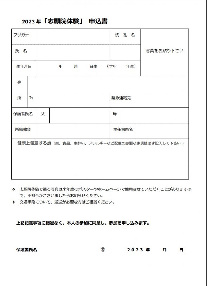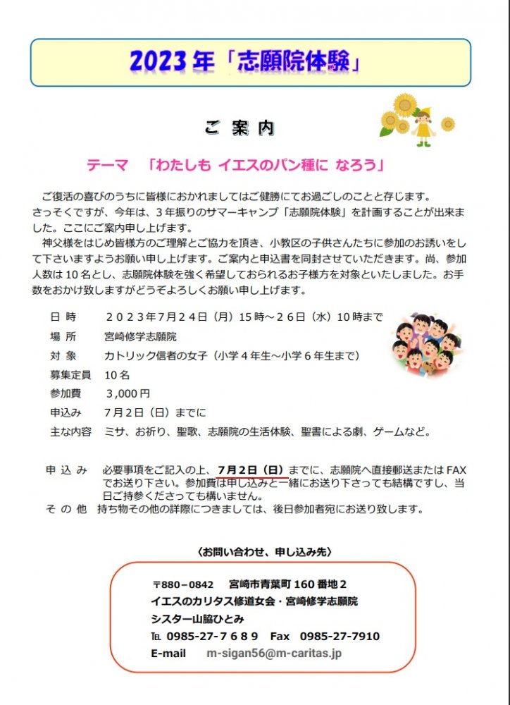 神父様をはじめ皆様方のご理解とご協力を頂き、小教区の子供さんたちに参加のお誘いをして下さいますようお願い申し上げます。尚、参加人数は10名とし、志願院体験を強く希望しておられるお子様方を対象といたしました。お手数をおかけ致しますがどうぞよろしくお願い申し上げます。