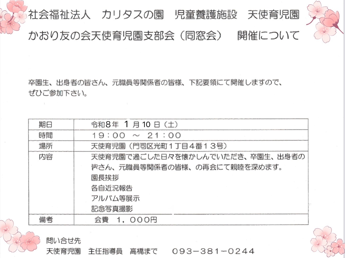 かおり友の会後援会 天使育児園支部会(同窓会)開催のお知らせ