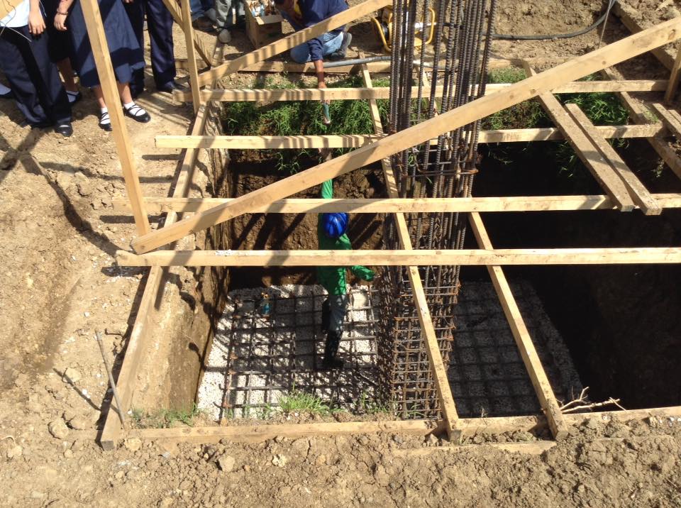 基礎の骨組みの間と四隅にマリア様のご像を置きこの建物がマリア様の保護の下に建てられ、ここで学ぶ生徒たちを守ってくださるようにと願いをこめて。