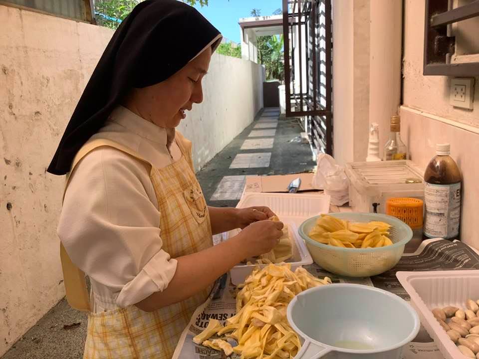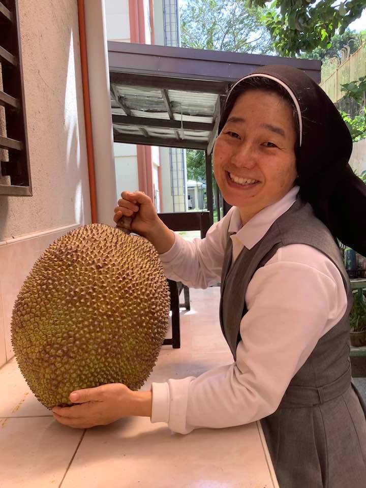見慣れていない人はだいたい最初、これをドリアンだと勘違いします。これはジャックフルーツ(フィリピンではランカ)というフルーツで、学校の敷地ギリギリのところに生えている木から年に2回実を付けます。大きいものはこの2倍くらいになったりします。この下処理は結構重労働で, 白い松脂のような液が手にこびりつくので、油を塗りながら行います。中に入っている種も食べれるので茹でピーナッツのようにして食べます。(あまり地元の人もしないらしい)