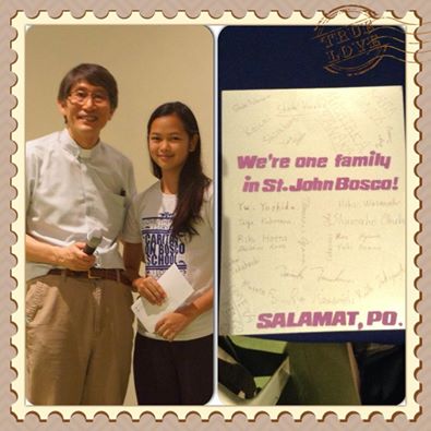 終了時には横浜の生徒たちからの寄せ書き、そして台風犠牲者のための寄付金を頂き丁度、今日参加していた避難してきている生徒に渡していただきました。このように日本の生徒たちと交流ができることは、フィリピンの生徒たちにとってもいい刺激になります。来年も来てくださるようです。