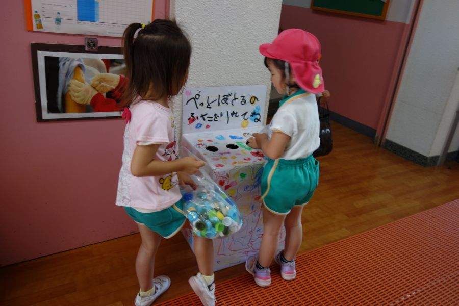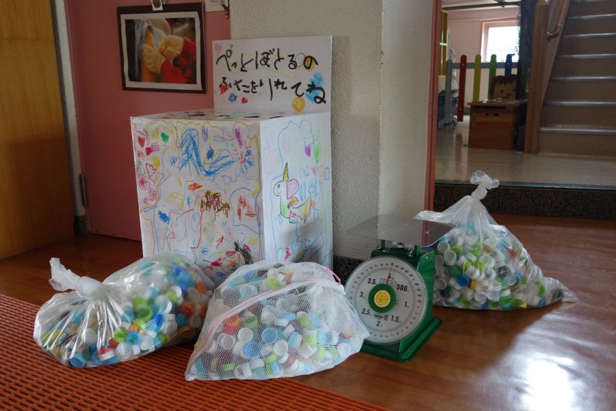 園長先生のお話がきっかけになり、ペットボトルのふたを集めるリサイクル活動も始まりました。