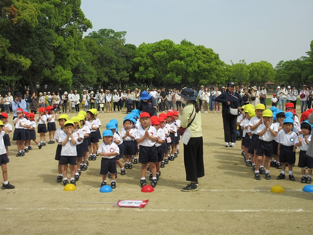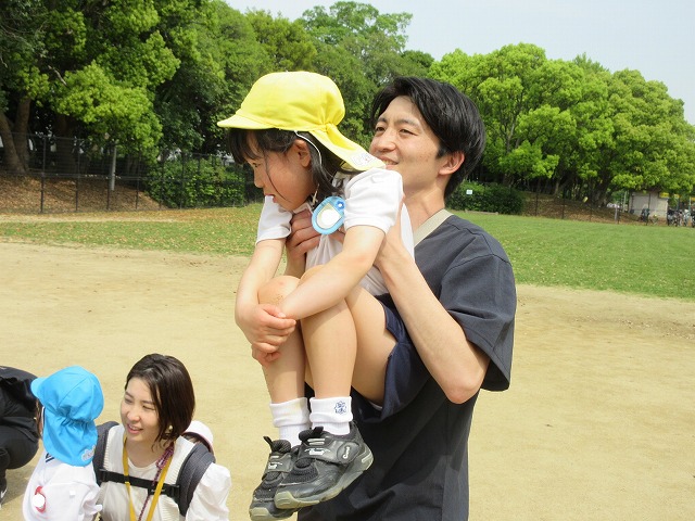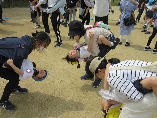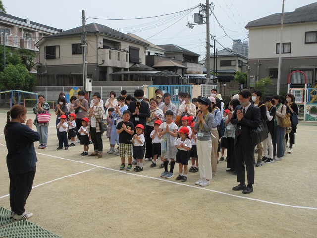 大きな広い公園で、神様に守られながらお家の人と親子で触れ合い遊びや、クラス毎の写真撮影やゲームを楽しみました♪自己紹介をし合って、お友だちも保護者の方たちも仲良くなれるといいですね!
