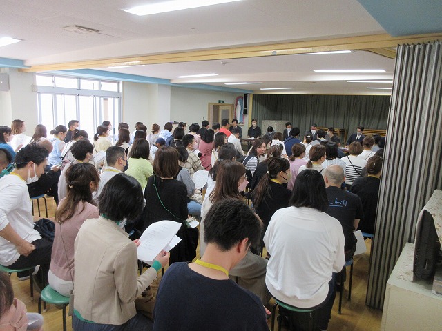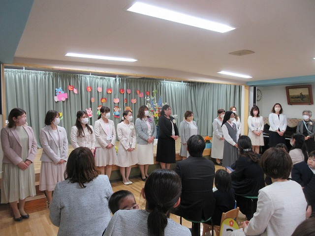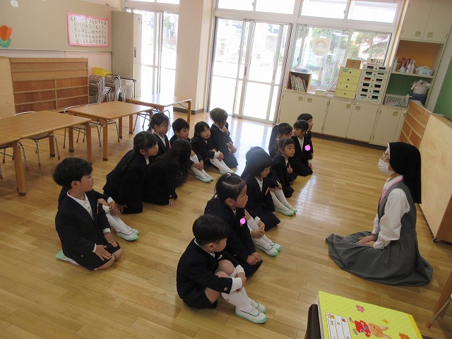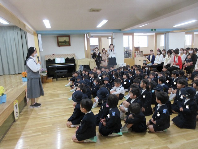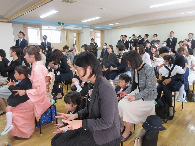 年長(ゆり)組・年中(ばら)組に進級した子どもたち。園長先生のお話を集中して聞いている姿に成長を感じますね。お母さん達と離れて待っている間も、しっかり先生のお話を聞きながら待つことができていて感心ですね♪