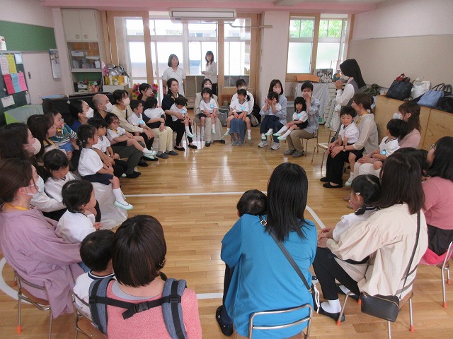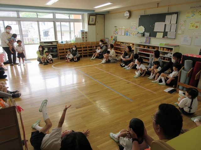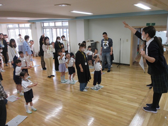 年少すみれ組さんは初めての参観日でした。手を合わせてお祈りする様子を見てもらったり、保護者の方と一緒に体操やゲームをして楽しみました♪