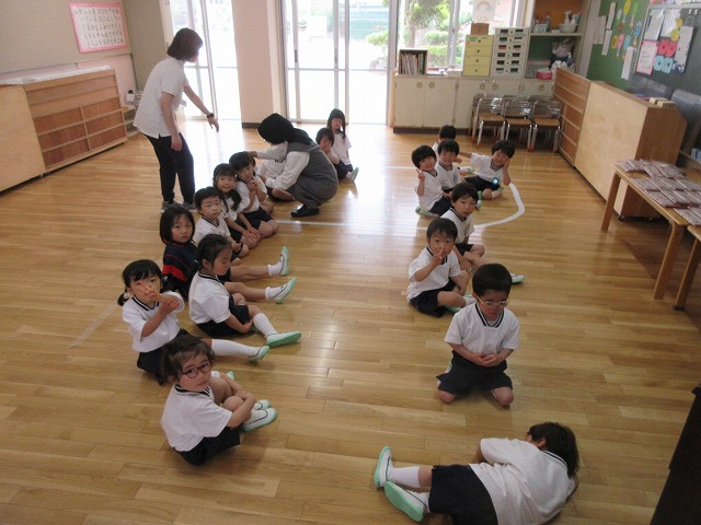 厳しい暑さにも負けず、毎回『今日はどんなことするのかな?』と楽しみに参加してくれる子どもたちです。この一学期で、登園したらシールを貼って→自分のロッカーに荷物を置いて→タオルを掛けて→トイレに行く という流れが身についてきました!この年齢の子どもたちは、スポンジのように吸収する力を持っているので、大切な生活習慣を今のうちにしっかりと身につけていってほしいと思っています(*^^*)