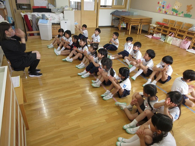 年長児(ゆり組)さんが一緒に楽しい手遊びを教えてくれて、緊張してた子どもたちも気持ちが少しほぐれたようですね(*^-^*)