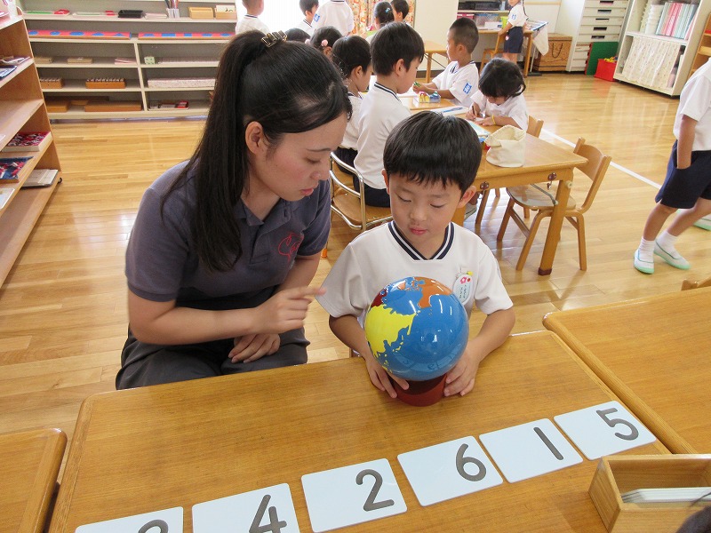 地球儀で大陸と海洋を知ります。 数字と同じ数だけ玉を置いてます。