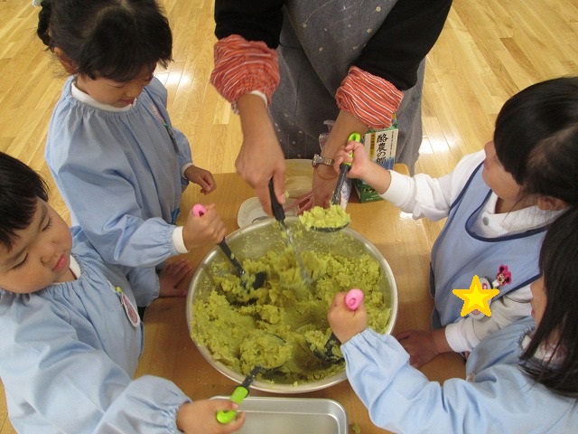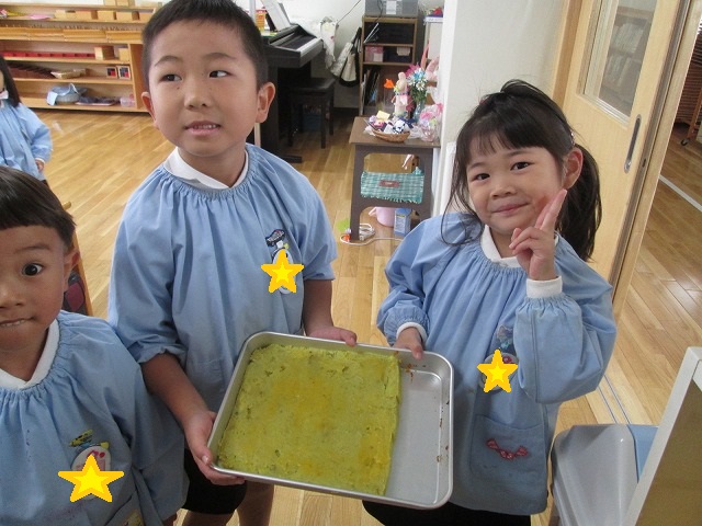 今日は縦割りデー、クラスで育てた「さつまいも」のクッキングを