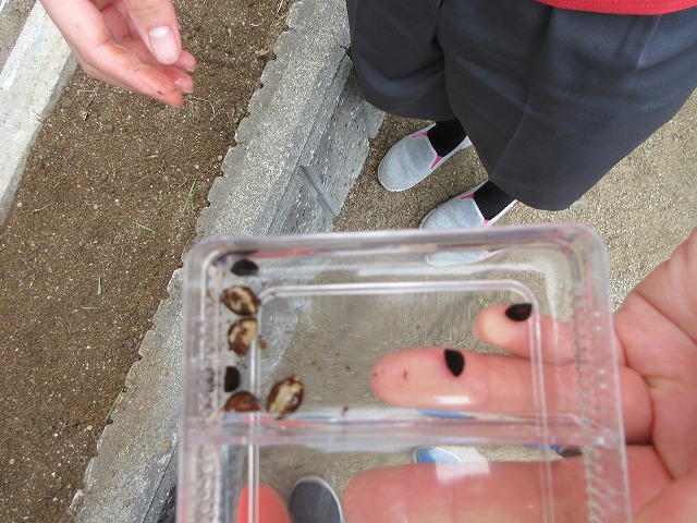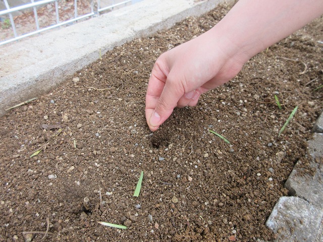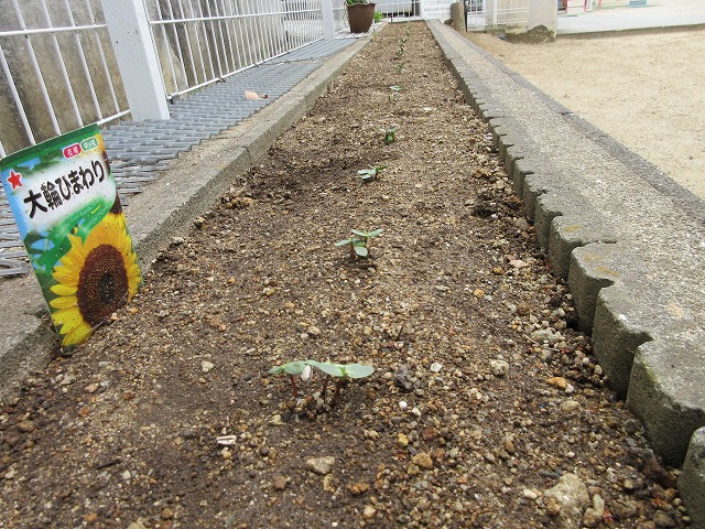 雨上がりに「ひまわり」と「けいとう」の種をまきました。