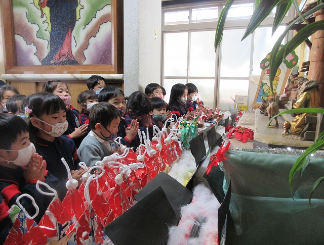 各クラスで子どもたちが作ったクリスマス献金箱を神様にお捧げし