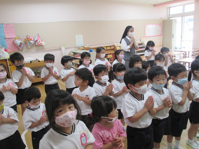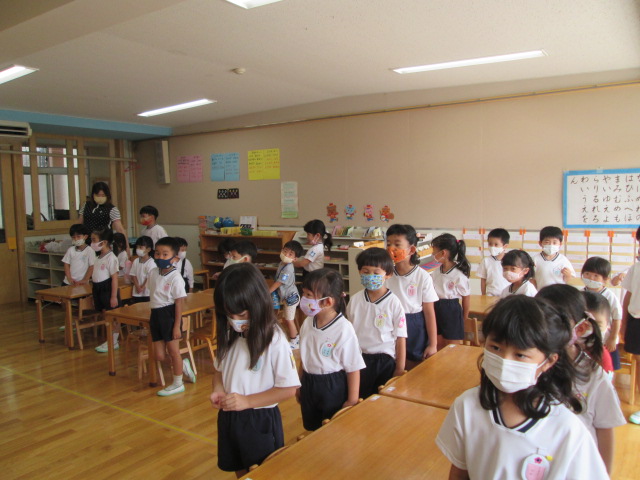 いつもはお遊戯室で始業式を行いますが、コロナ渦のため