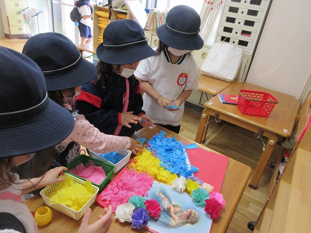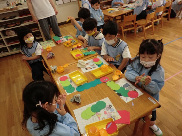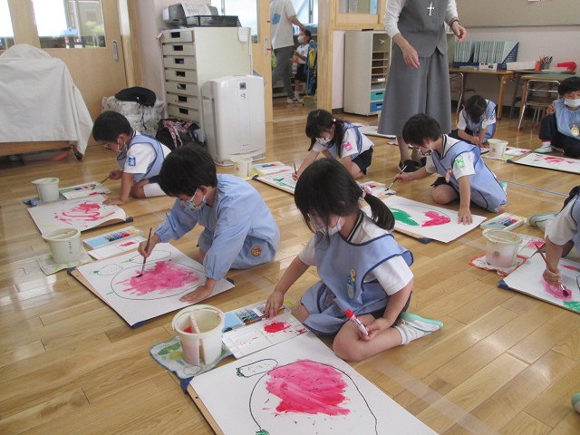 使い方や片付けの仕方が、とても難しいですが、さすがばら組さん、先生の説明をしっかりきいて、絵の具をとても楽しんでいました。