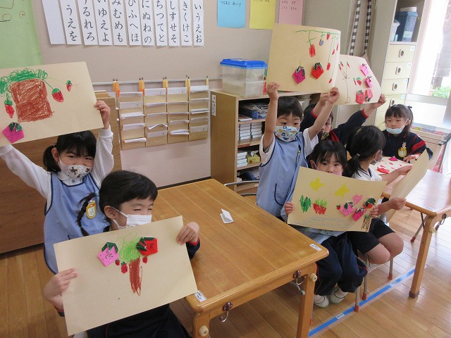 折り紙と、クレヨンでおいしそうなイチゴのできあがり♡