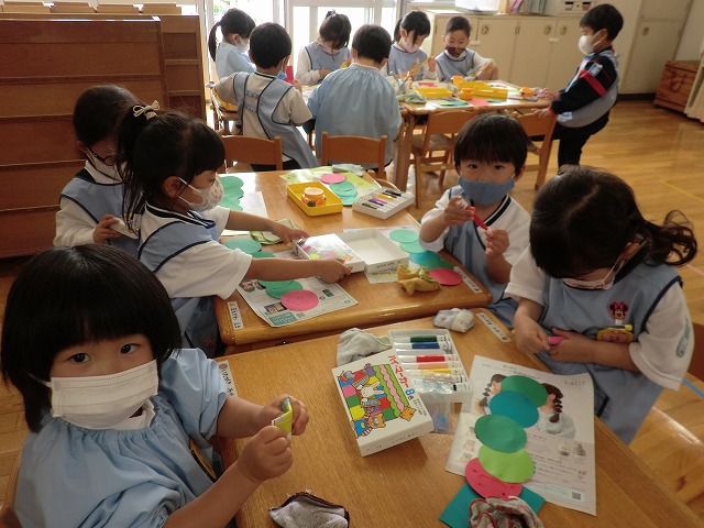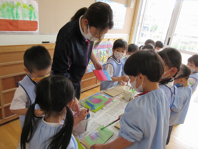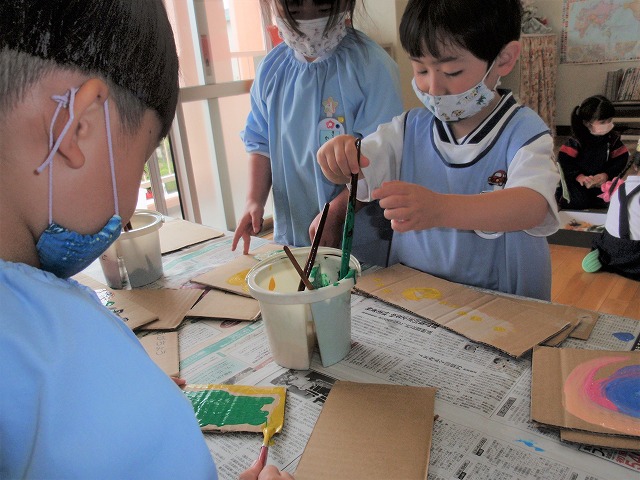 今度は、絵の具の色を混ぜたり、色の変化を見たりして、楽しんで絵画製作の取り組みを行っていきたいと思っています。子どもたちもとっても楽しみにしています。