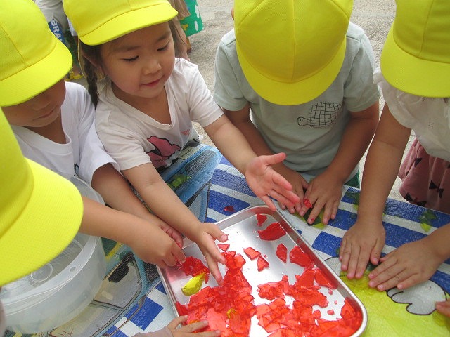 水あそびのなかで、寒天の感触遊びもしました。