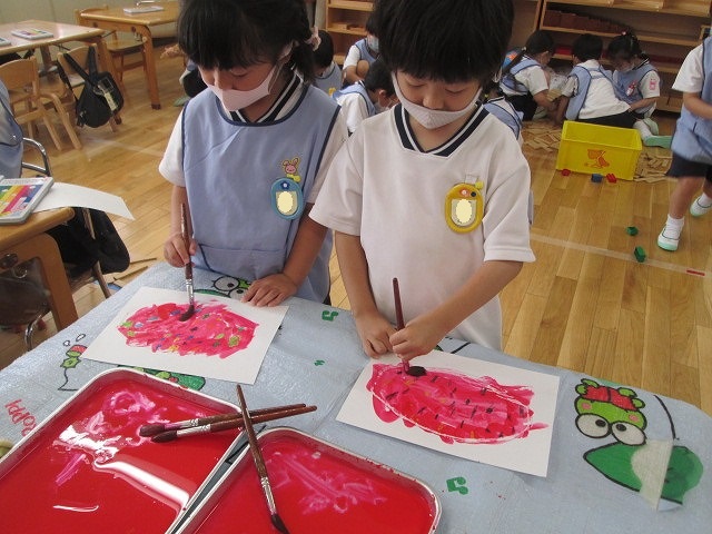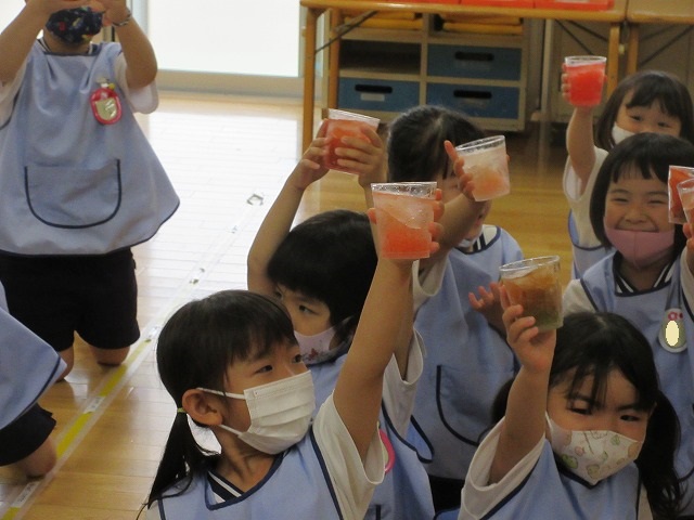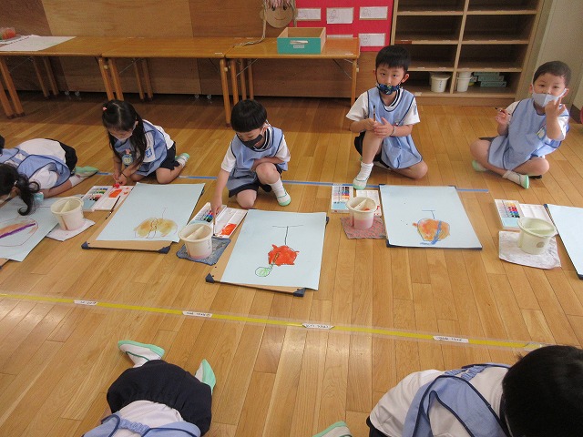 赤と黄色を混ぜるとオレンジ色に変身!!!子どもたちは思い思いのオレンジ色を作り、ミックスジュースを描いていました♡