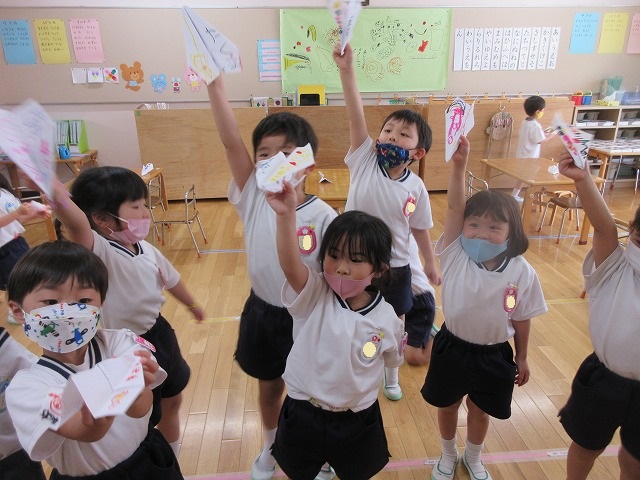 自分たちで作ったお気に入りの紙ヒコーキ!何度も何度も飛ばしていました。