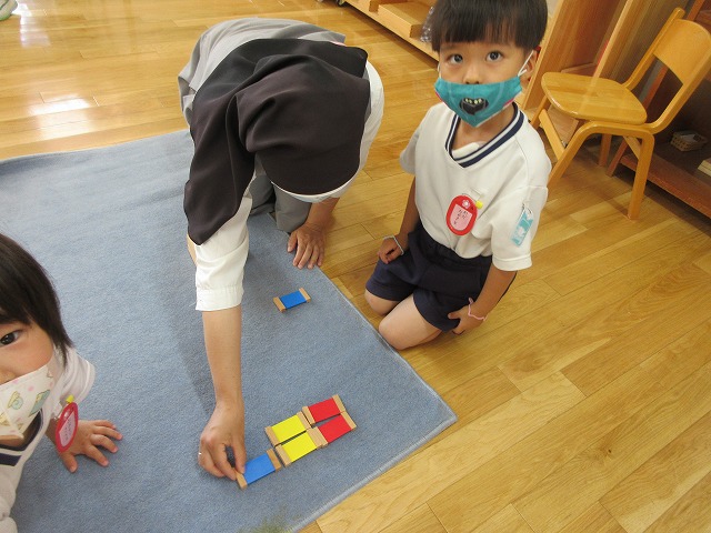 年少さんや、初めての教具を扱う時は、先生と一緒におしごとに取り組みます。