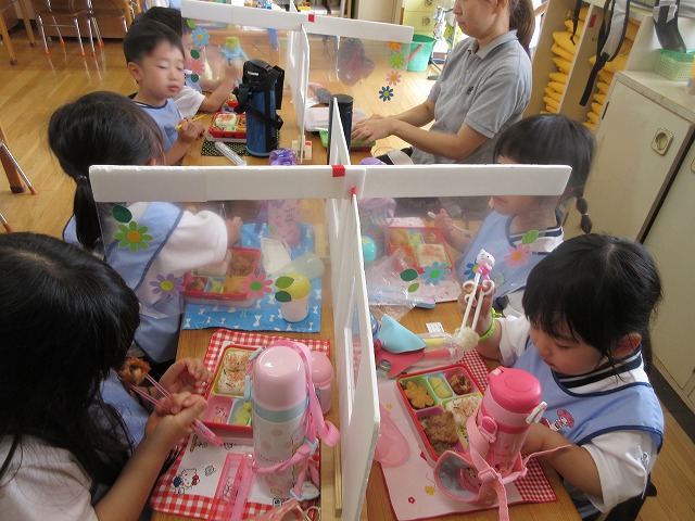 初めはフォークやスプーンも上手く使えなかったすみれ組のお友だちも、おにいさん、おねえさんを見たり、教えてもらいながら、上手に使えるようになり、楽しいランチタイムとなっています。
