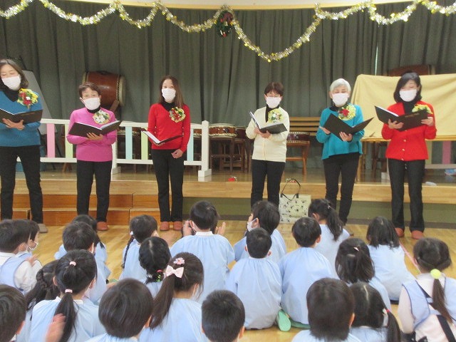 音楽が大好きな子どもたちのために、当園で働いている教諭が所属するコーラス隊が来て下さいました。普段お世話になっている楽しい先生がちょっといつもと違う雰囲気で次々素敵なクリスマスソングを披露してくれて、子どもたちも嬉しそうでした。しっとりとした曲では、ハーモニーに耳を傾け、静かに聴く事が出来ました。途中体を揺らしながらリズムに乗って楽しんでいるようでした。