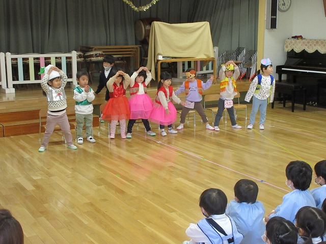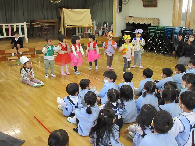 最後はことり組(満3歳児)さんの『おおきなかぶ』の劇でした。歌や踊りも入った、とってもかわいい発表でしたよ♪異年齢クラスでいつもお世話しているお兄さん・お姉さんたちは興味津々。伸びあがって観劇し、「かわいい!」「じょうず!」と大きな拍手を送ってくれました。