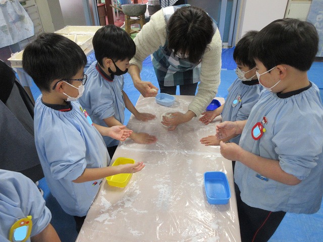 ゆり組さんは自分で食べるお餅を、餅切り名人の先生指導の下、自分で丸めましたよ♪