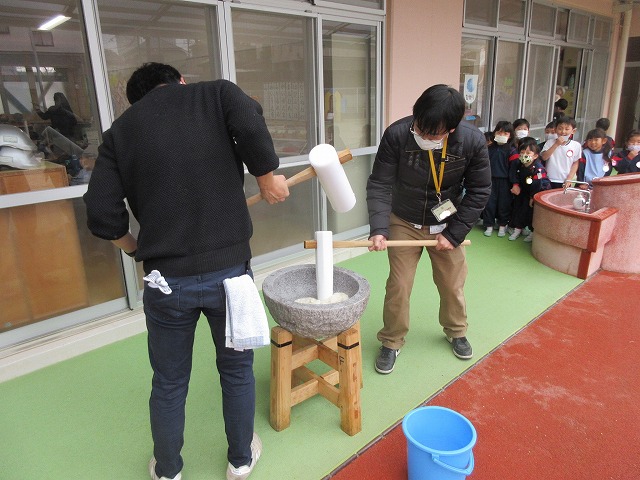 お餅のお替り注文が入って、急ピッチでお餅をつくお父さんたちに『頑張って~!!』と子どもたちから熱い声援が送られました(;^ω^)