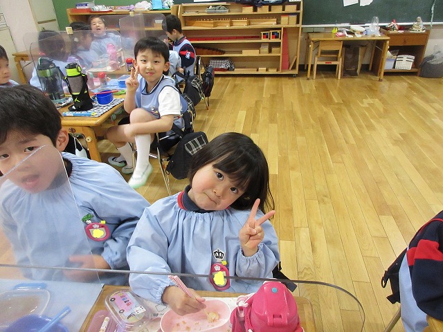 すみれ組さんもばら組さんも、一口サイズのお餅を少しずつ噛みちぎってとても上手に食べていました。