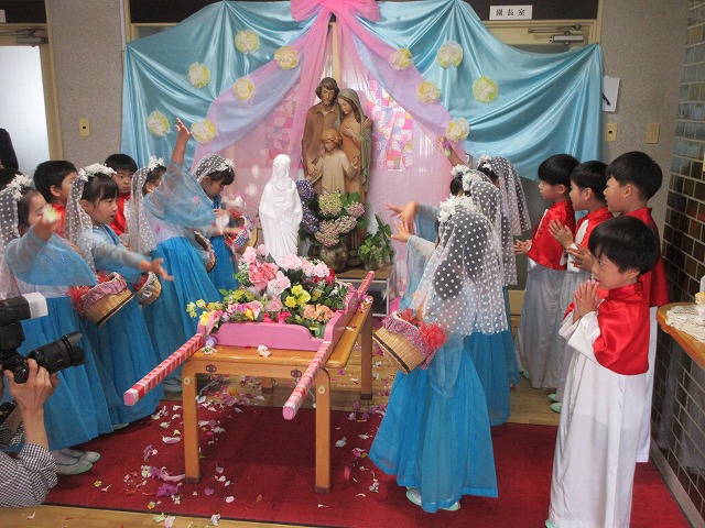 きれいなお花の花びらを巻き、マリア様を讃え祈ります。