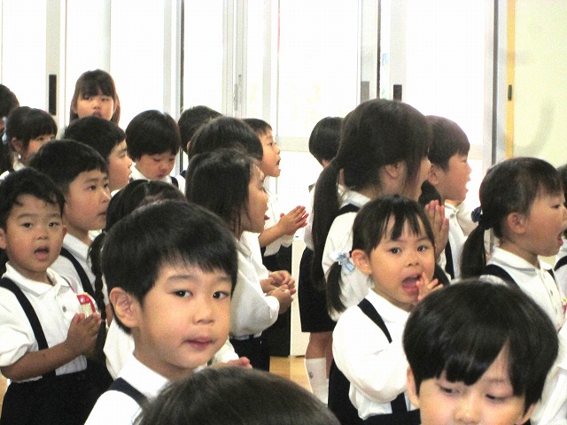お遊戯室では、年中さん・年少さんがお祈りをしていました♡