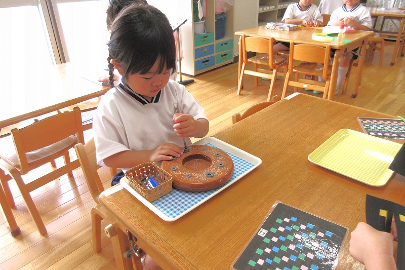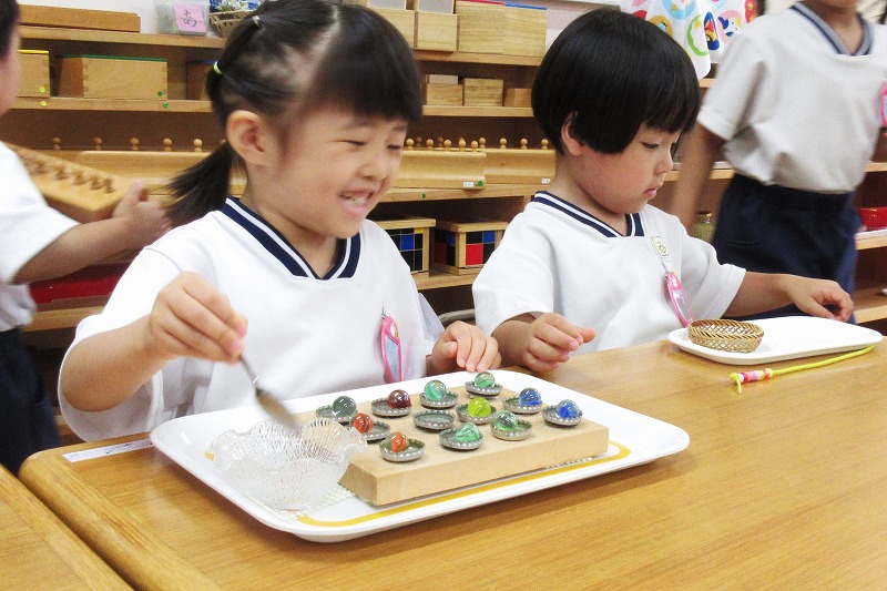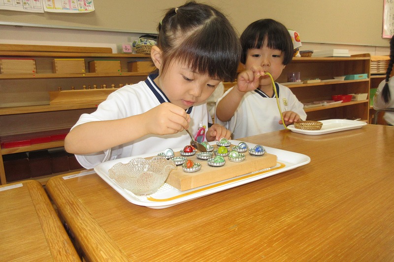 スプーンからビー玉が落ちないように集中して取り組む姿