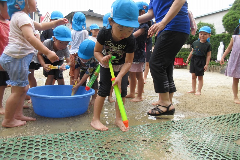水でっぽうで地面にかけたり、遠くへ水を飛ばしました!!