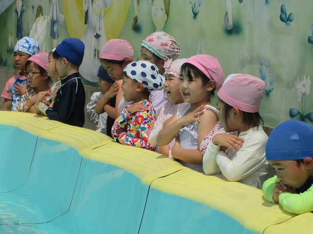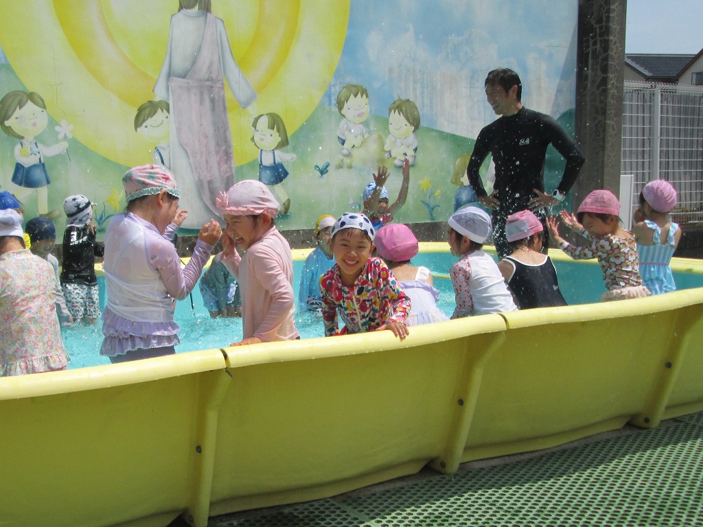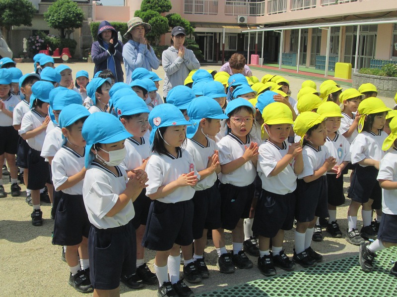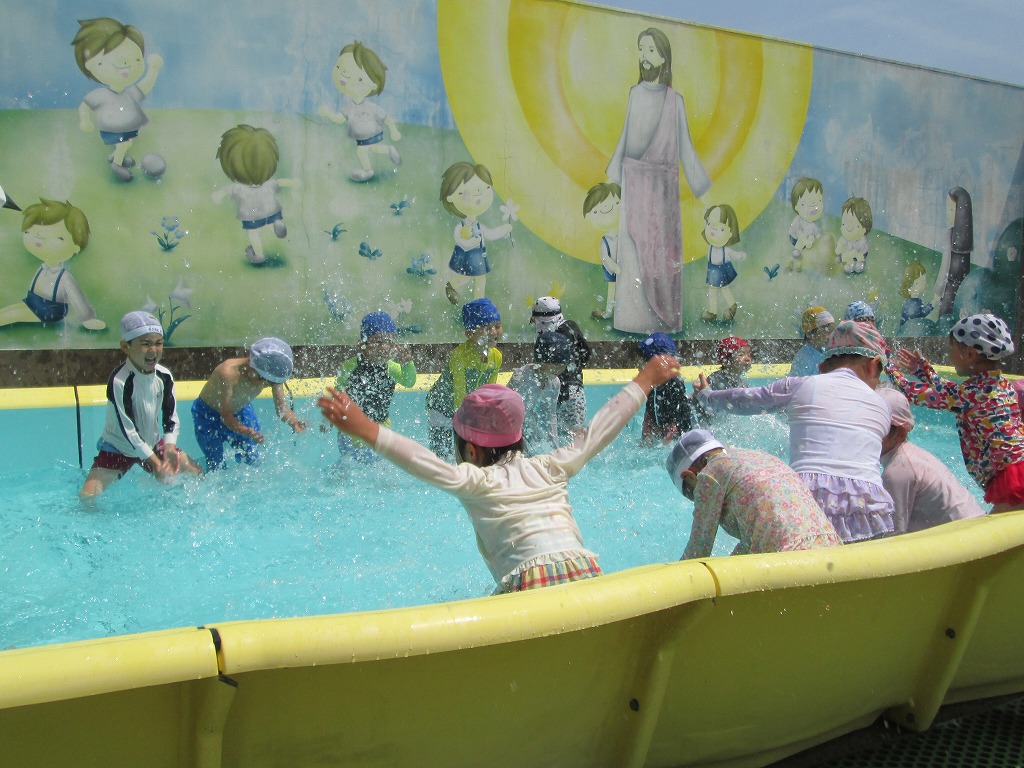 園長先生のお話を聞いて、みんながお約束を守って楽しいプール遊びの時間となるように、また、あらゆる危険から守られますように、神様にお祈りをしました(*^-^*)