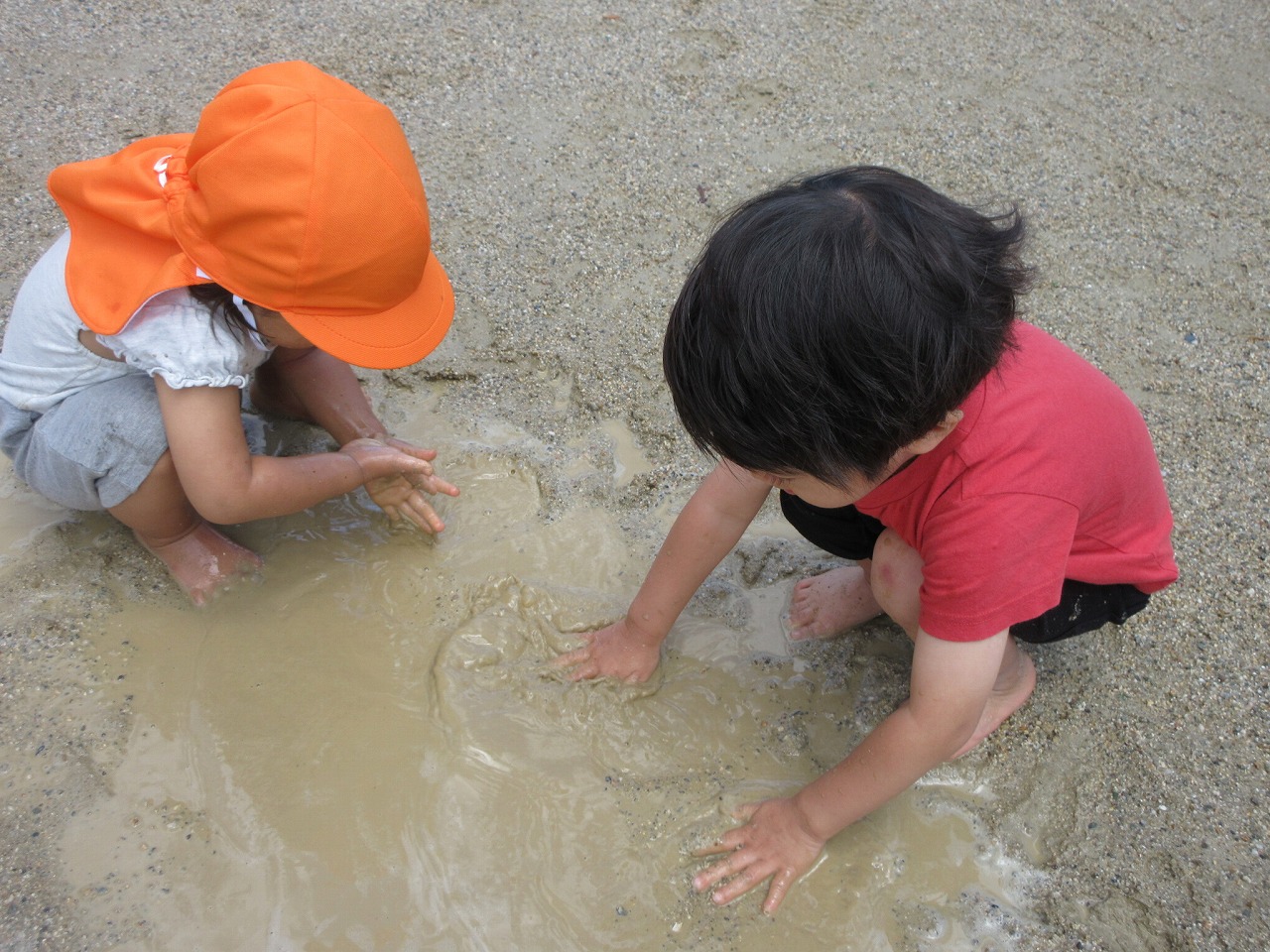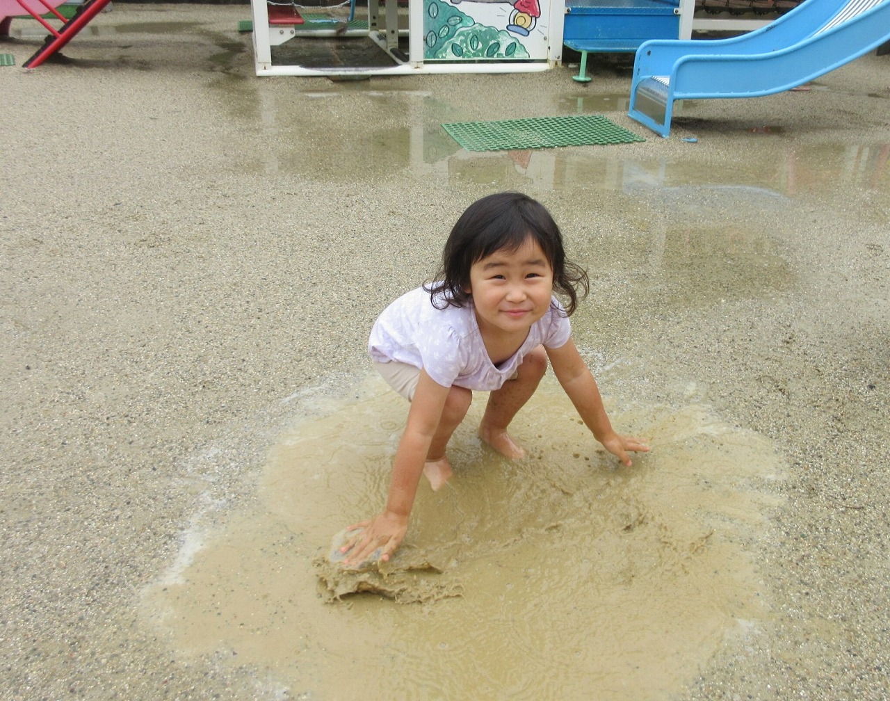 雨上がりの後の園庭は、子どもたちにとって大喜びな環境でした♪普段はきっと注意されるであろうどろんこ遊びを全身で楽しみましたよ☆