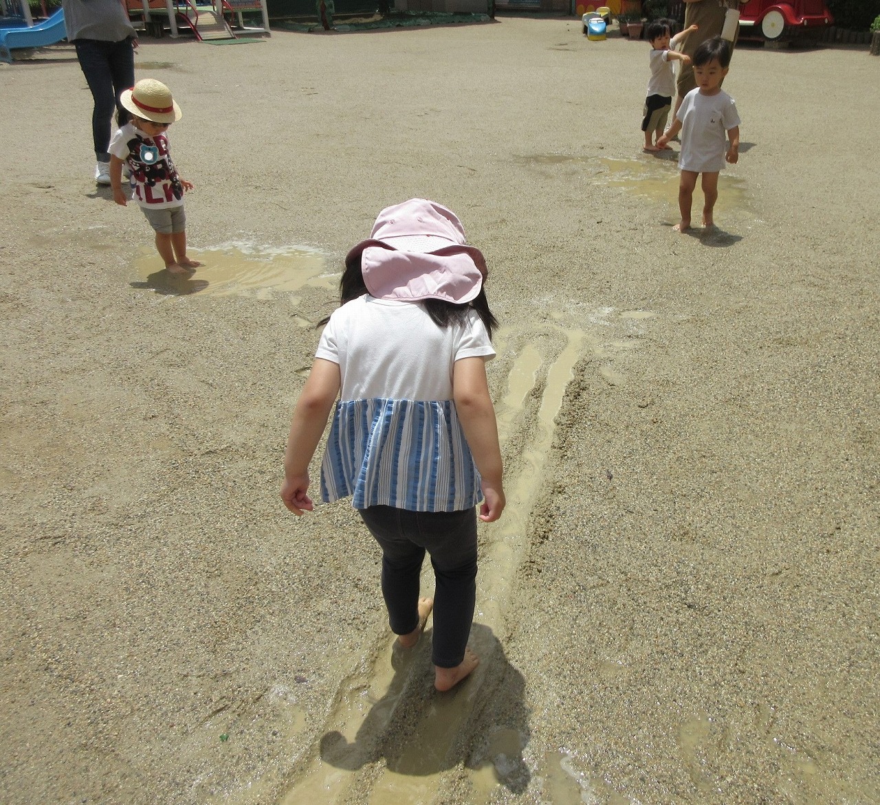 助走をつけて水溜まり目掛けて大ジャーンプ!!先生やお友だちが作った道を何度も繰り返し通って楽しんでいました♪