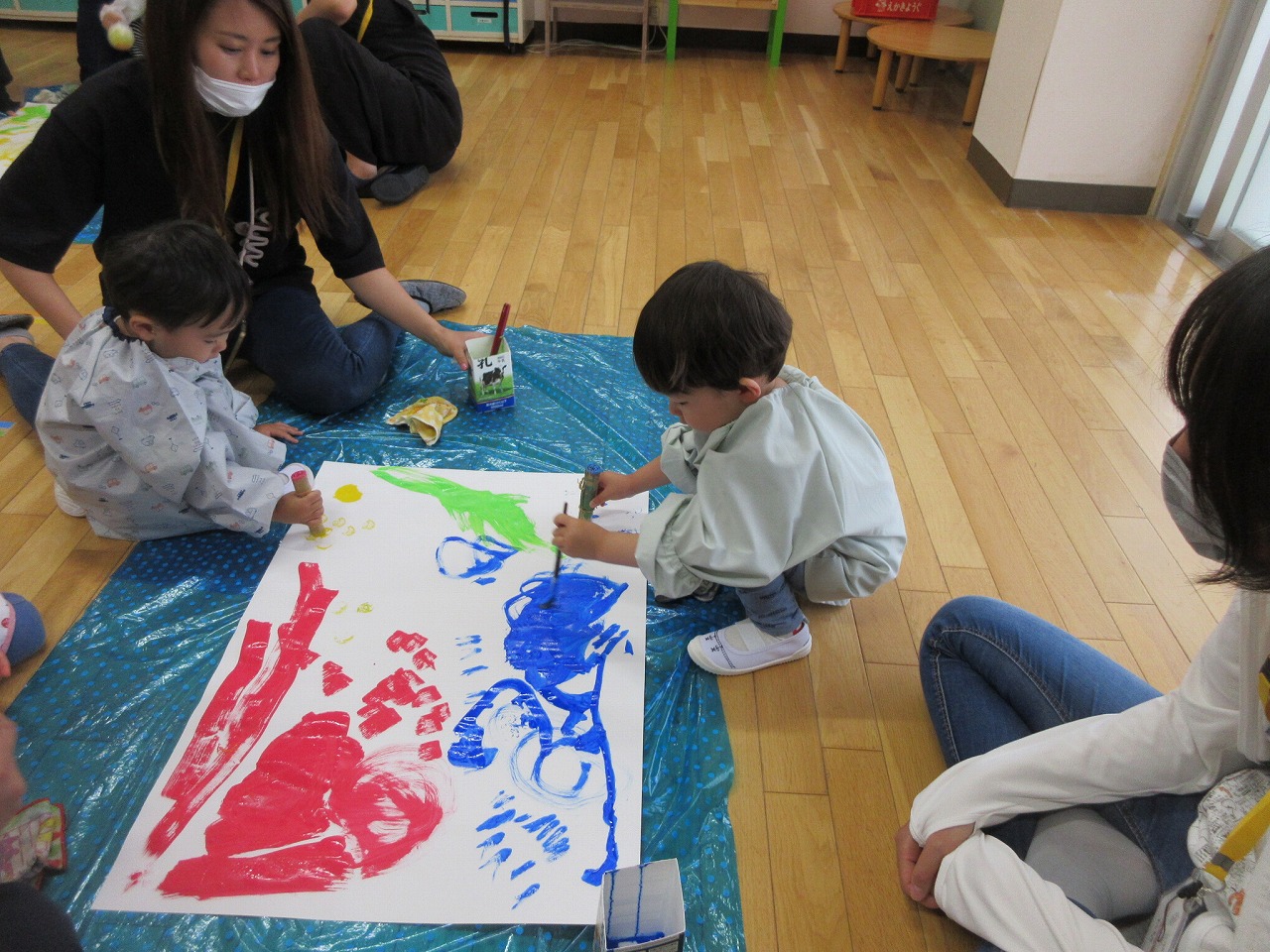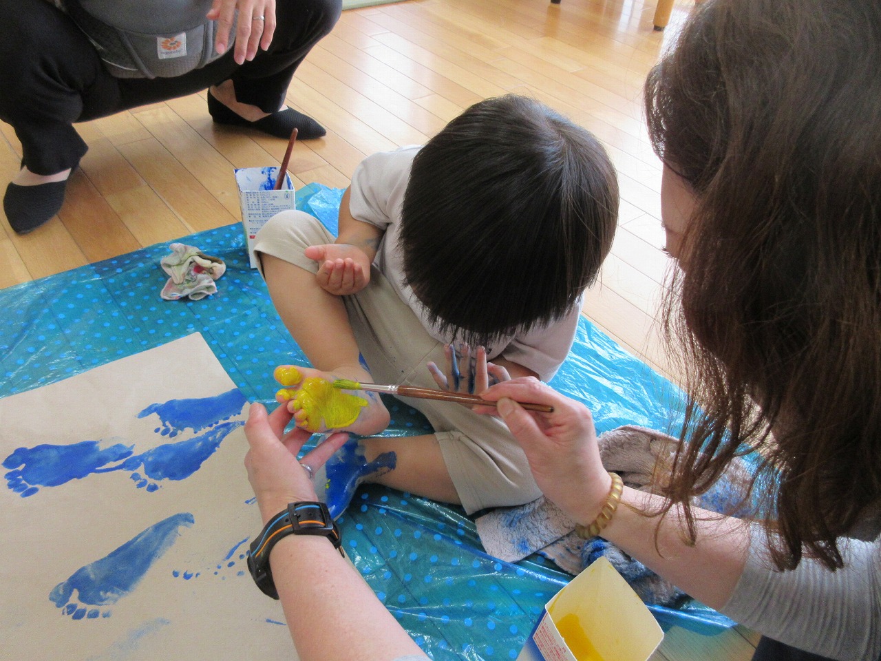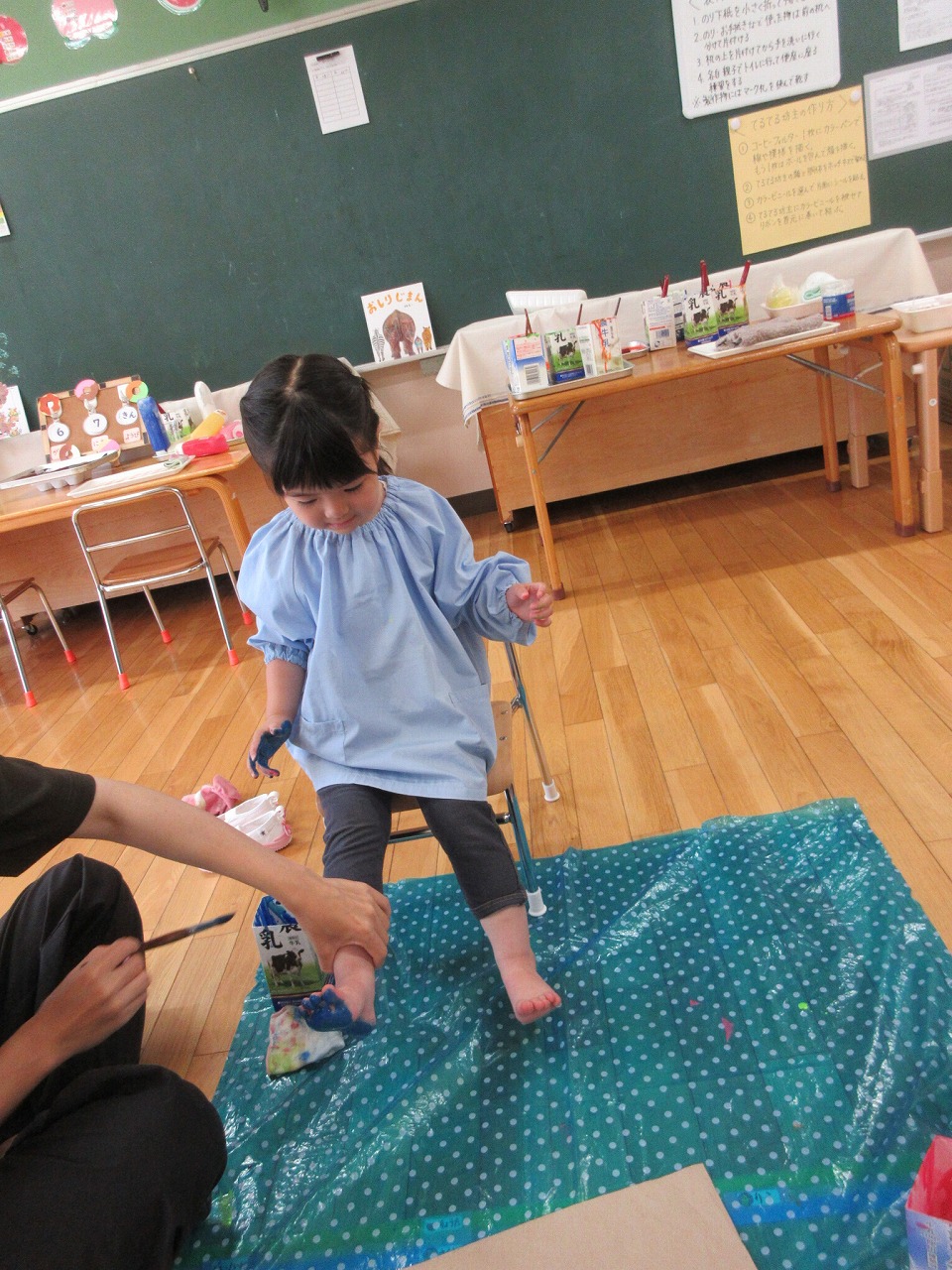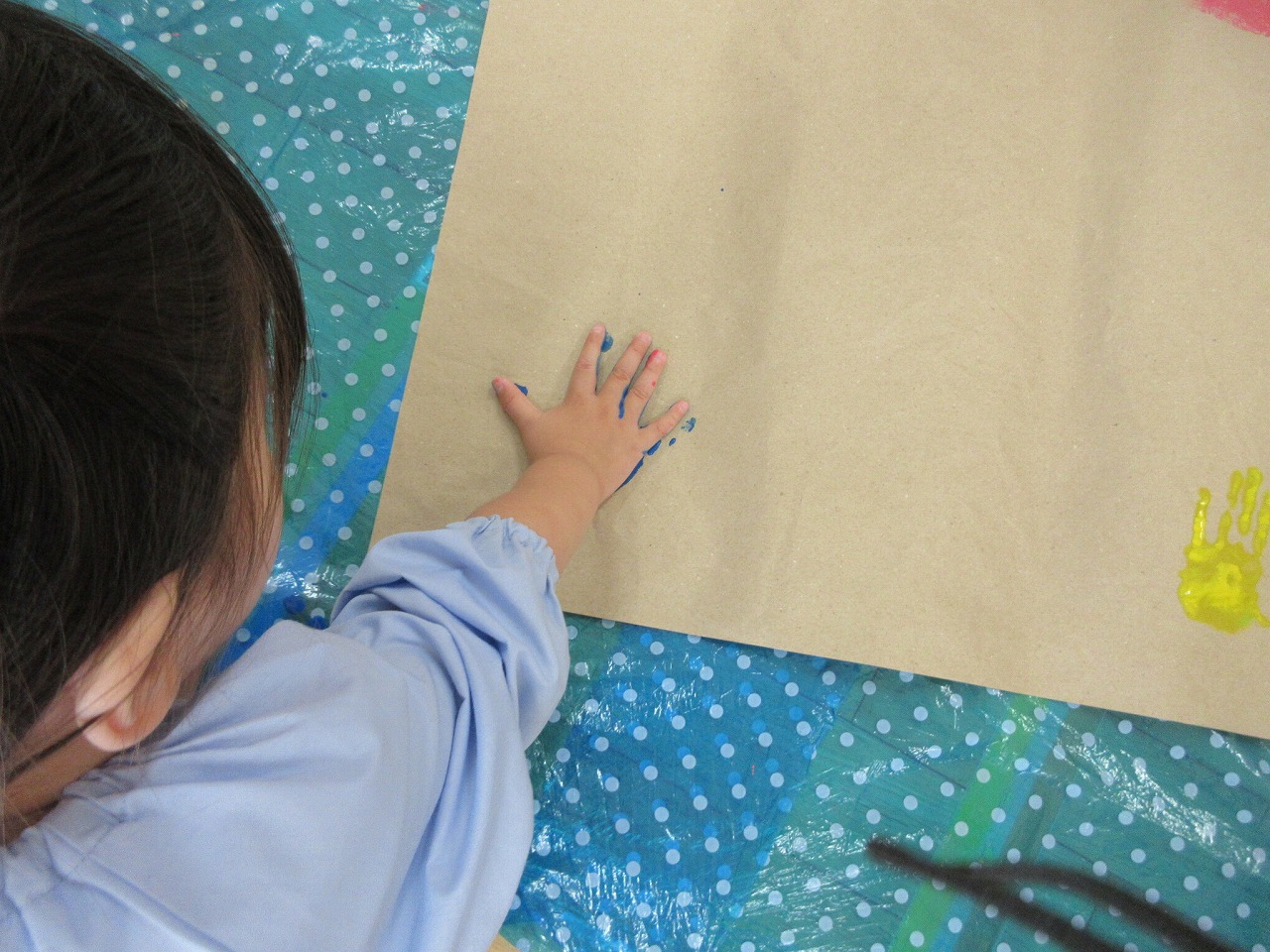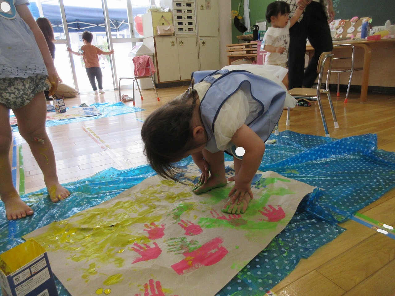絵の具遊びでは筆やスポンジスタンプだけでなく、手や足に絵の具を塗って手型・足型スタンプをペタペタと楽しんでいる子もいましたよ♪筆の感触がくすぐったくて笑顔溢れる時間を楽しみました。